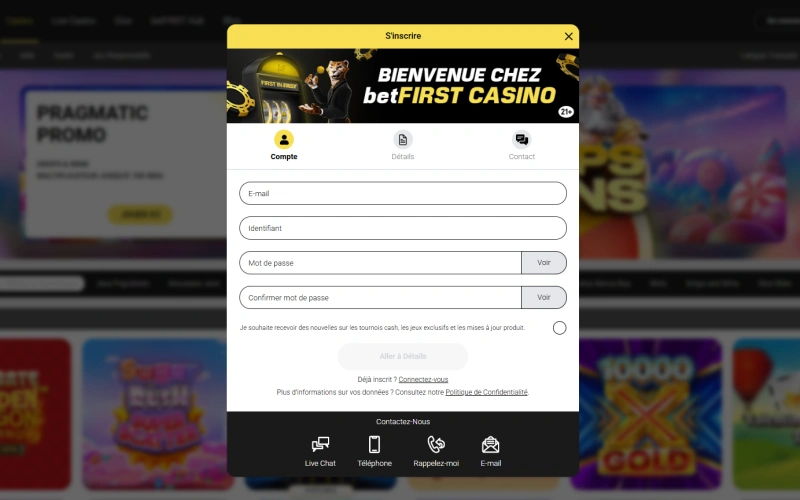 Étapes pour votre BetFIRST casino inscription :